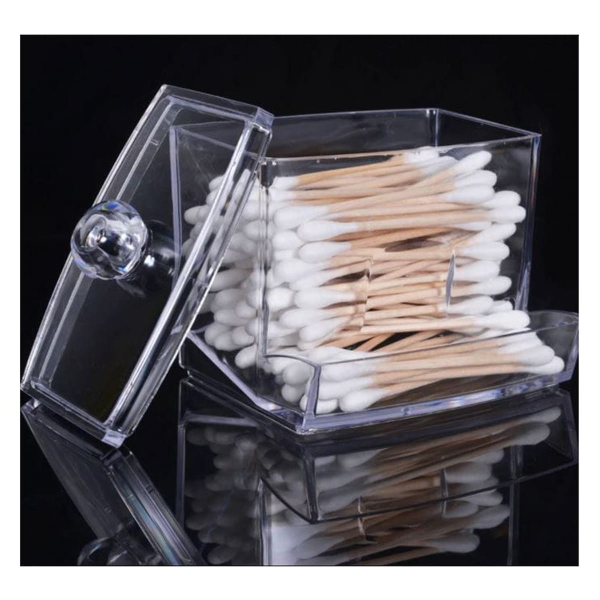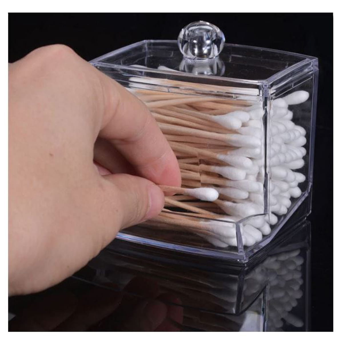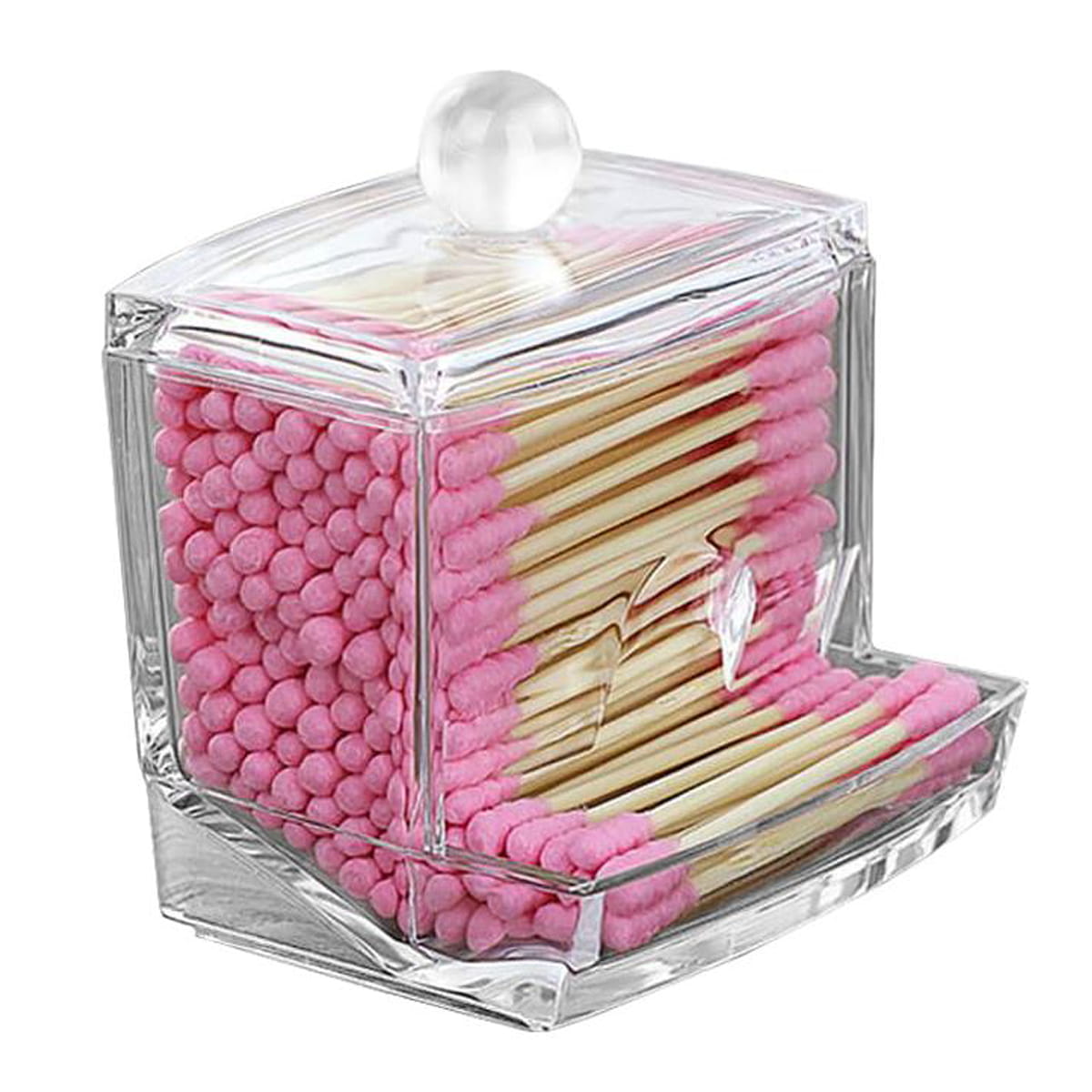 Praktyczny przezroczysty pojemnik z podajnikiem do przechowywania i organizacji patyczków kosmetycznych do uszu. Organizer zapewnia higieniczność przechowywanych w nim patyczków.